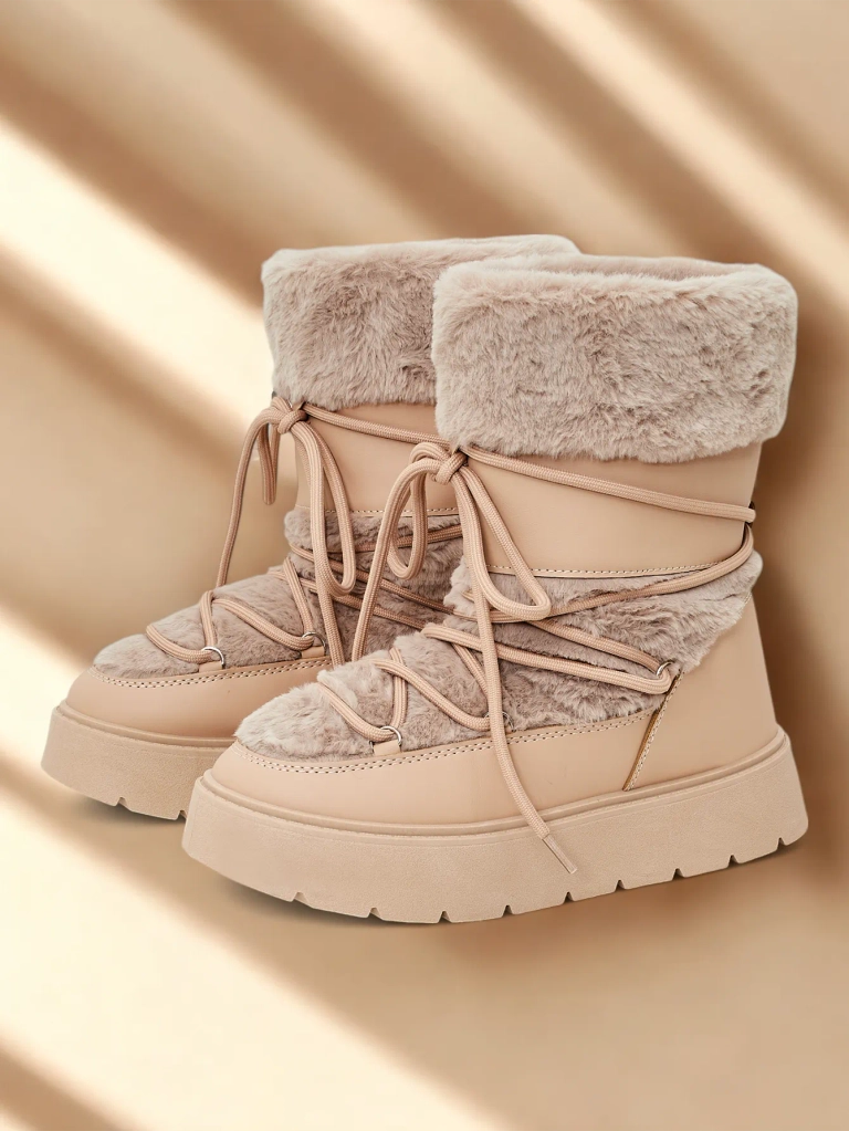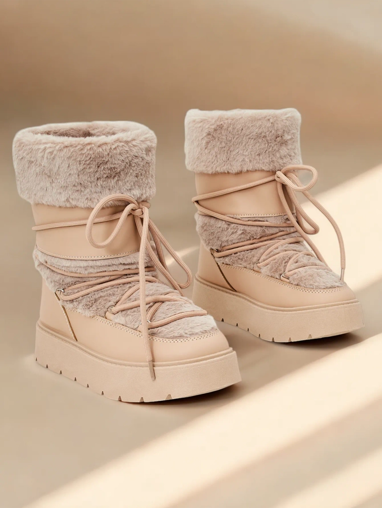 - Women's snow-type shoes with a shaft made of a combination of eco-leather and pleasant fabric. Inside there is a pleasant fur lining, the footwear has a laced shaft. Perfect for winter!