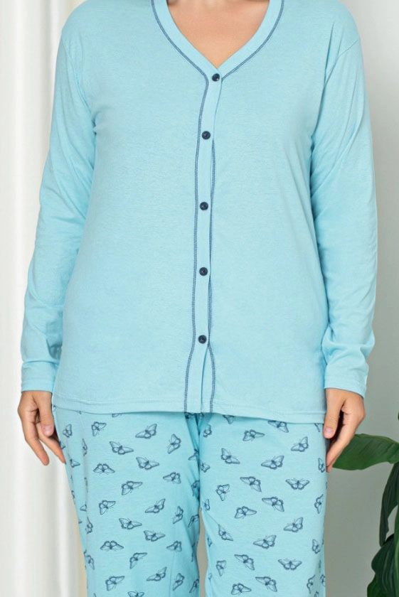 • Women's 2-piece pajama made of cotton fabric finished with decorative print. The set includes a blouse with long sleeves and buttons and pants with an elastic waist and straight legs.
