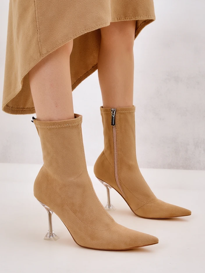 - Stylish women's eco-suede ankle boots - the perfect solution for cooler days. The model features a zip fastening and an eco-leather insole. The model has a stiletto heel and a pointed toe.