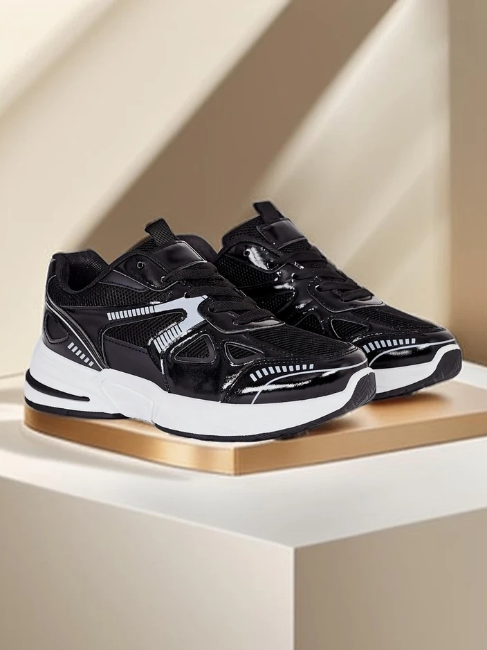 - Women's athletic shoes in a sneaker style with a flat sole. Made of patent faux leather with fabric inserts. The insole is made of fabric. A great addition to your everyday casual outfits!