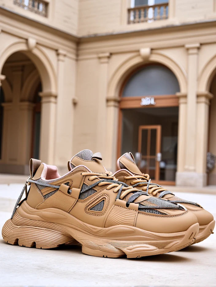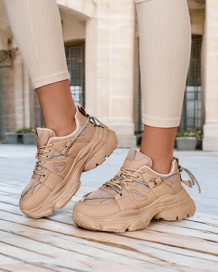 - Women's sports shoes in sneaker style with a thick sole. Made of eco-leather with fabric inserts. The insole is eco-leather. A great addition to your everyday casual outfits!
