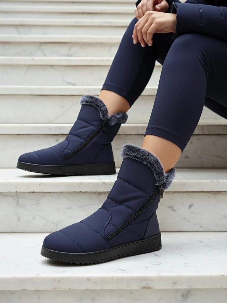 - Great women's winter snow boots with a flat heel. The upper is made of fabric, and the inside is insulated with fur. The model has a zipper closure. An ideal base for winter!