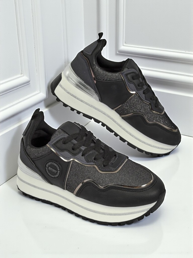 - Women's sneakers with a thicker sole. Made of ecological leather and glitter material, and a fabric insole. A great addition to your everyday casual outfits!
