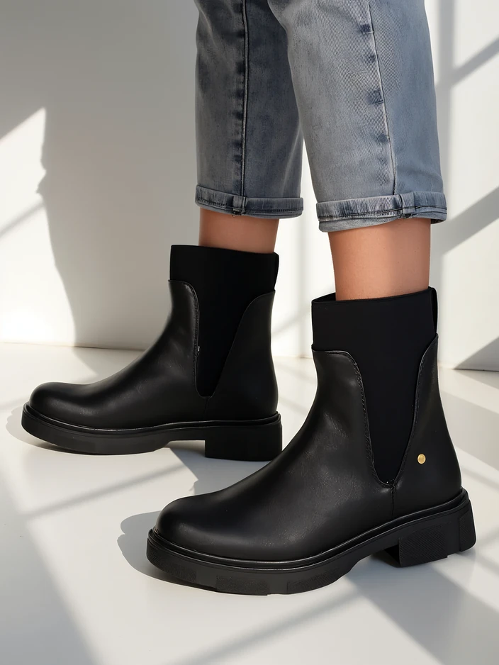 - Amazing women's ankle boots with a flat heel, made of eco leather. The interior is made from a fabric insole. Elastic inserts on the sides provide a perfect fit!