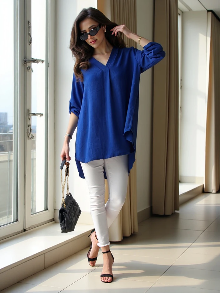 - Classic long women's oversized shirt made of pleasant fabric. It features a V-neck and long rolled-up sleeves. The simple cut ensures a fit for every figure! NOTE: Measurement accuracy (+/-) 1 cm.