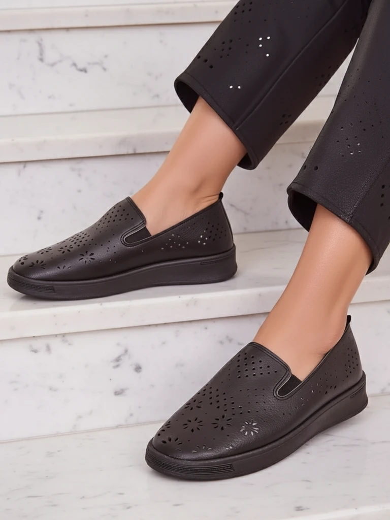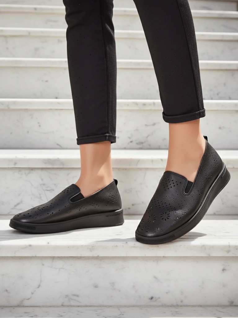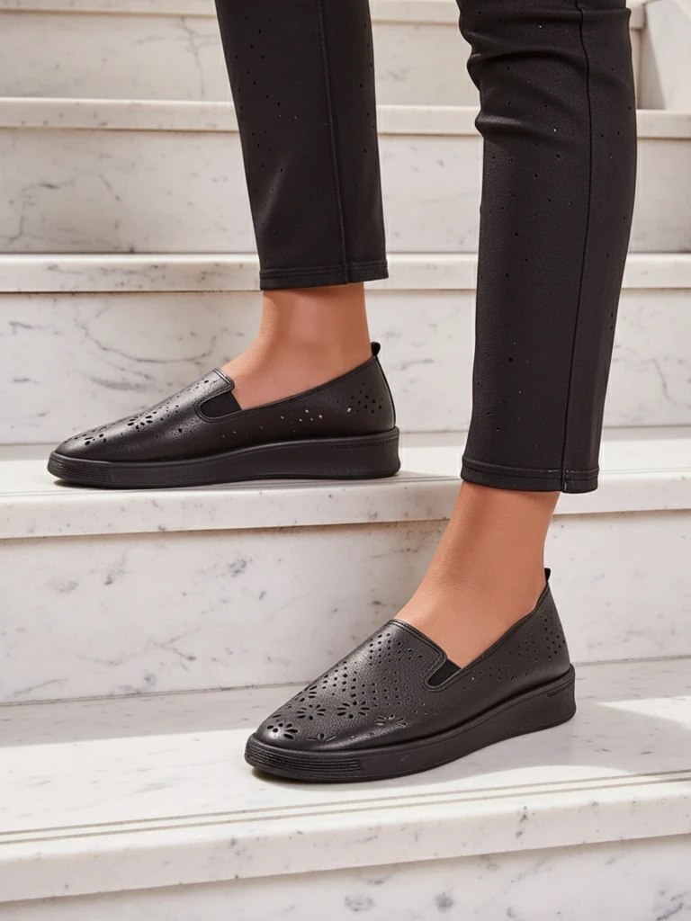 Our black women's shoes (Black Elegance Icon) are an excellent choice for every modern woman. Made of high-quality eco-leather, they guarantee not only a stylish look but also comfortable wear. Eco-leather is an environmentally friendly material. Additionally, the shoes are equipped with a fabric insole, which ensures comfort and breathability on warm days. A distinguishing feature of our shoes is the flat heel with a height of 2.5 cm, which guarantees stability and comfort while walking. Perfect for everyday wear as well as for special occasions, these shoes fit perfectly into current fashion trends. To make the best use of our product, we recommend a few styling options: 1. Combine them with classic fabric trousers and a blouse for an elegant but comfortable office outfit. 2. Wearing them with leggings and an oversized tunic will create a fashionable and comfortable shopping outfit. 3. Combined with a floral dress and a denim jacket, you'll get a casual summer look. The shoes are easy to clean. Just wipe them with a damp cloth to restore their shine. Remember to store them in a dry place, away from heat sources, to enjoy their excellent condition for as long as possible. In current spring and summer fashion trends, great emphasis is placed on comfort, which makes our shoes a great choice for every fashion enthusiast. Choose Black Elegance Icon and discover how much comfort and style these shoes can give you every day.