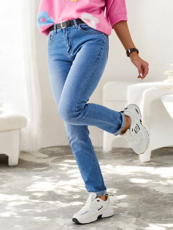 - Women's straight jeans made of cotton fabric. Medium rise model, fastened with a button and zipper. Two pairs of pockets - at the back and front. A hit this season!