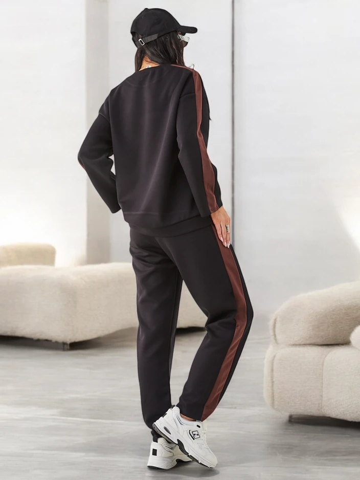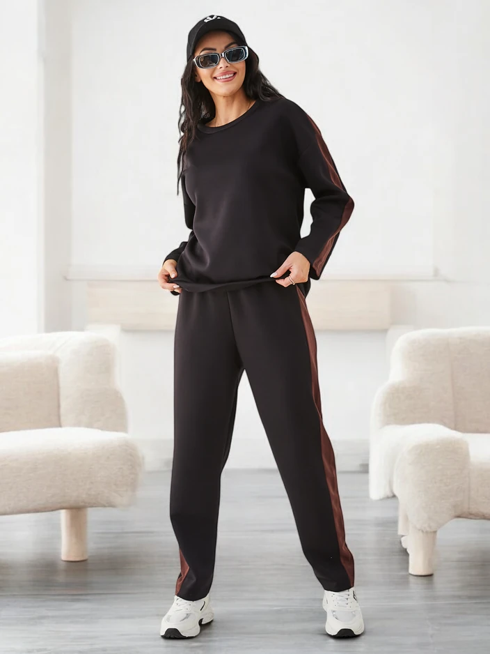 - Women's tracksuit set made of pleasant fabric. The pullover sweatshirt features long sleeves and a round neckline. Straight pants with 2 slip pockets and elastic at the waist. Ideal for those who value comfort.