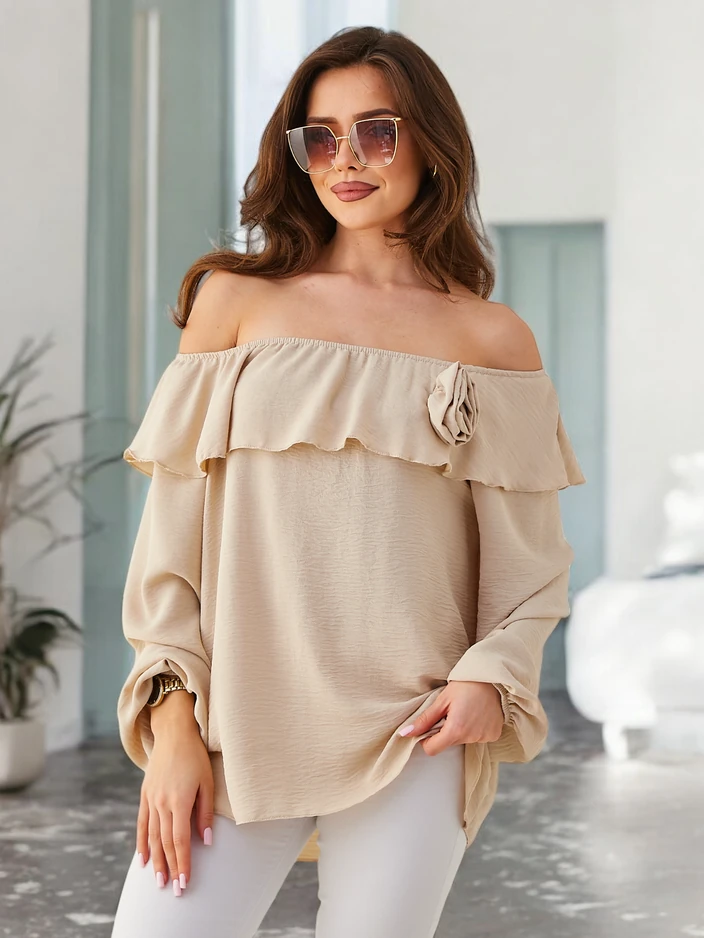 - The off-the-shoulder top with a ruffle at the neckline is an elegant and feminine option for any occasion. With elastic at the neckline and long sleeves, it perfectly fits the silhouette, providing comfort and freedom of movement. The subtle ruffle adds l