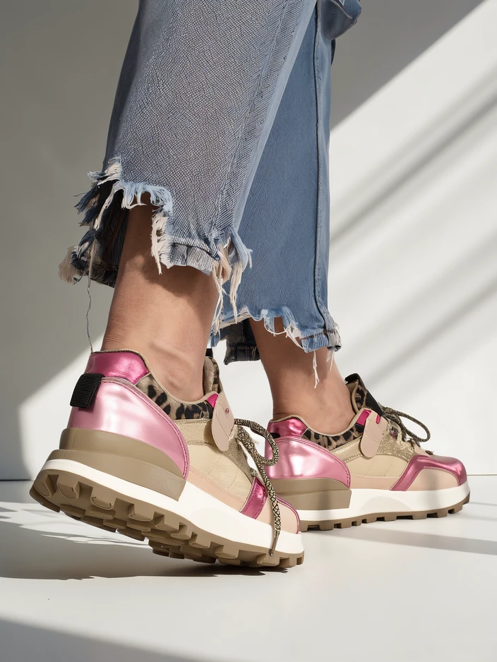 - Women's sporty sneakers with a flat sole, made of eco-leather and fabric. The model features a fabric insole and a thicker sole. Pair them with wide pants and a shirt!