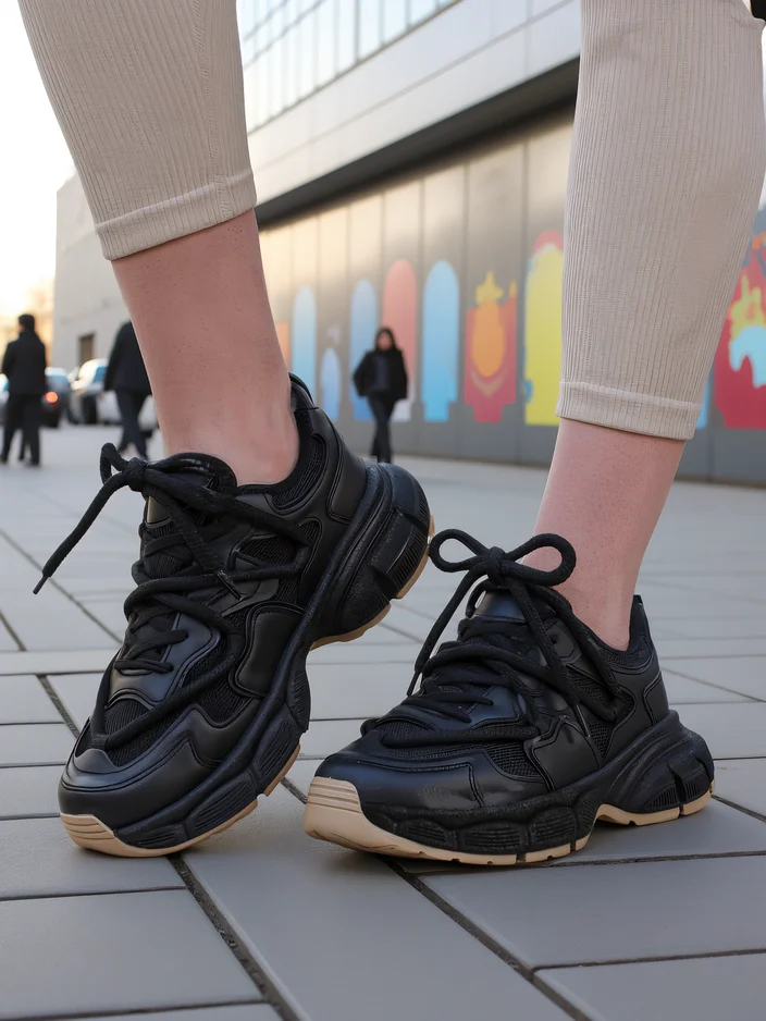 • Women's sports shoes made of eco-leather and mesh. Model with a thicker sole. Laced upper. They will fit perfectly with everyday outfits!