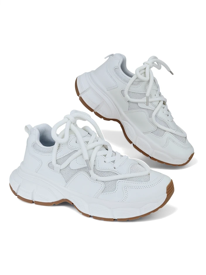 - Women's sports shoes made of eco-leather and mesh. Model on a thicker sole. Laced upper. They will fit perfectly into everyday outfits!