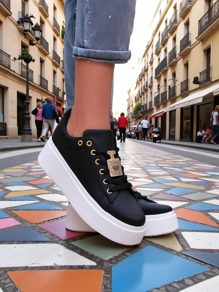 - Women's flat-soled sneakers - a perfect combination of style and comfort. Footwear made of ecological leather. Laced model with a fabric insole. Ideal for active people!