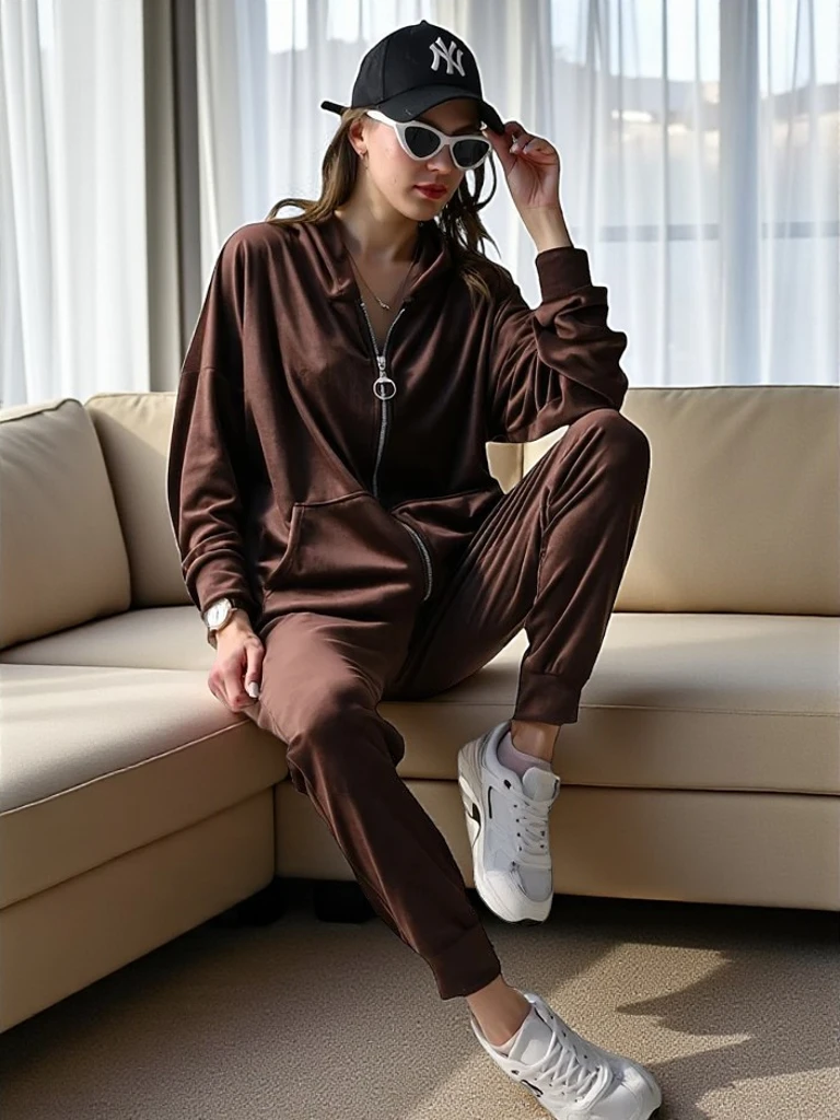 - Women's set a'la velvet made from pleasant material. Zip-up hoodie with a hood. Long trousers with an elastic waistband, 2 pockets. Feel the style in this wonderful set!