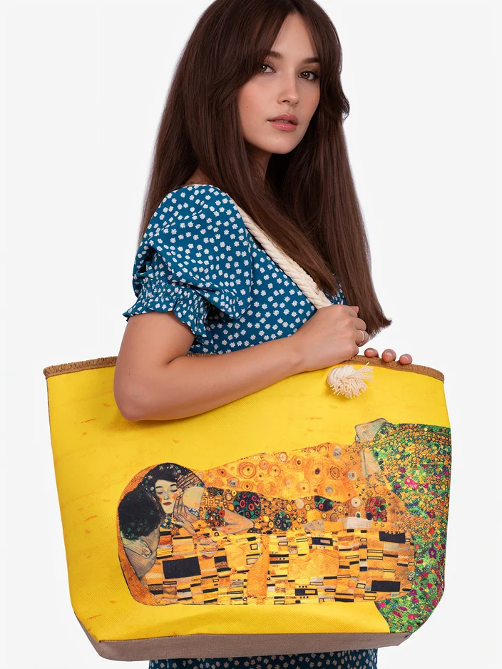 - Stylish fabric bag finished with a print. The bag has longer handles, zipped, and contains 1 pocket inside. It is great for the beach!