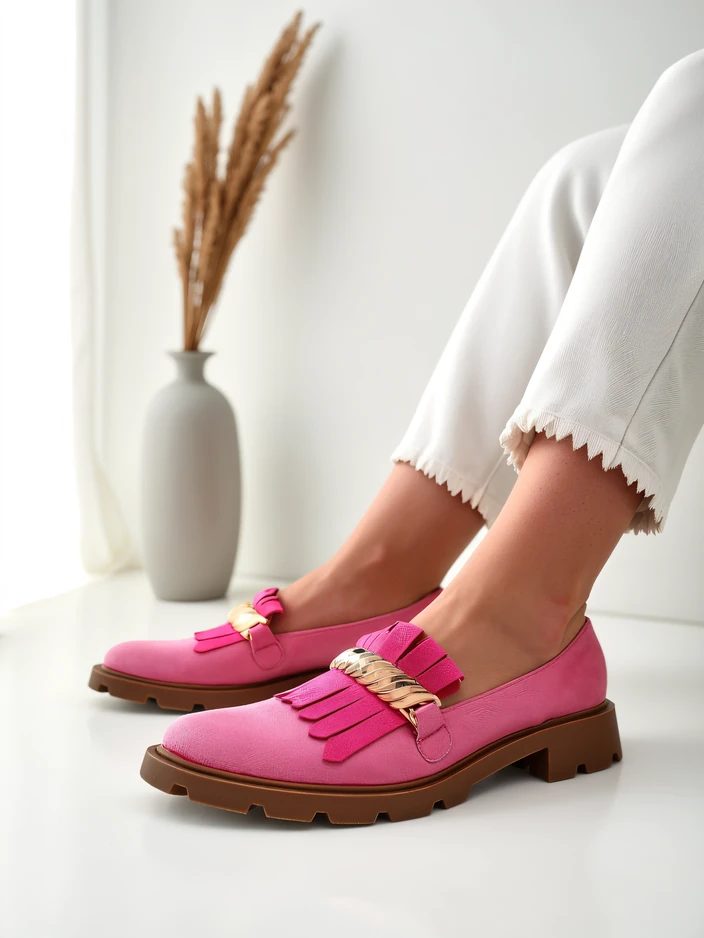 - Beautiful women's flat-soled moccasins. The model is casual in style and is made of eco-suede and has an eco-leather insole. The toe is rounded and features decorative tassels. An ideal base for many everyday looks!