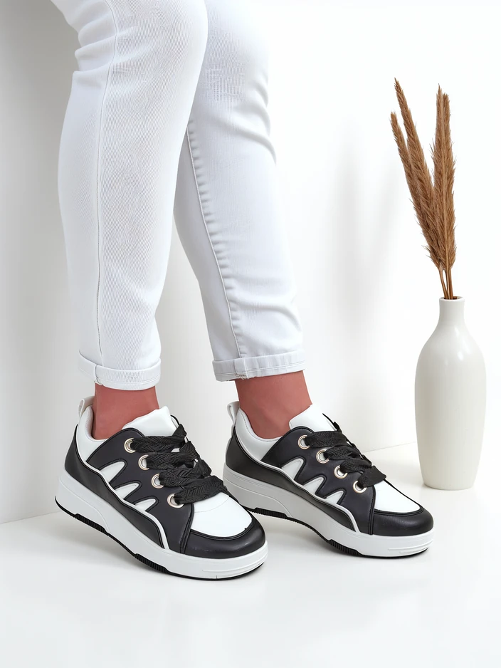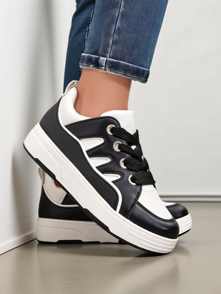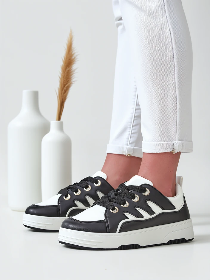 - Women's Sneakers on a Flat Sole - a perfect combination of style and comfort. Footwear made of synthetic leather. Laced model with a fabric insole. Ideal for active people!
