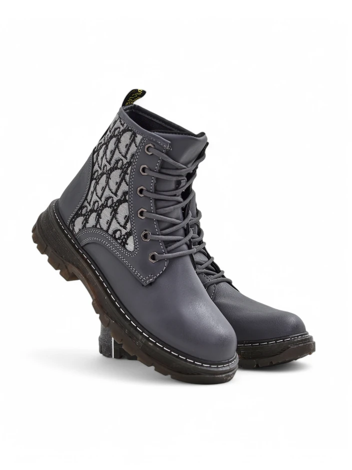 - Amazing women's ankle boots with a flat heel, made of eco-leather and fabric with print. The interior is filled with fabric. Laced model.