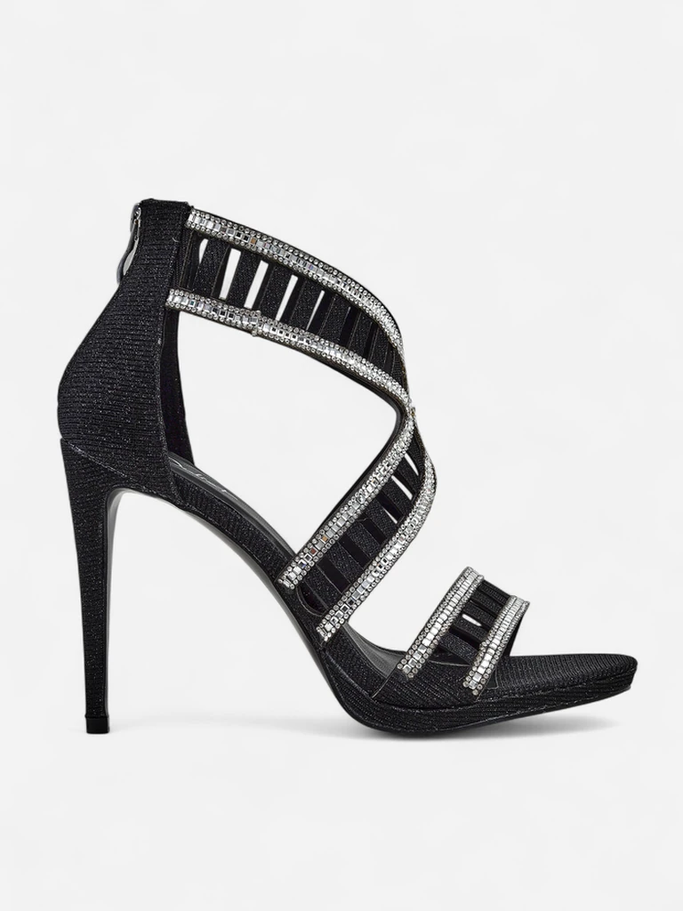 - Heeled sandals made of eco-leather, fabric, and an eco-leather insole. The upper consists of decorative straps and rhinestones. A combination of style and comfort. The stiletto heel adds subtle elegance, and the zipper makes them easy to put on. Perfect f
