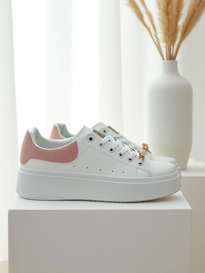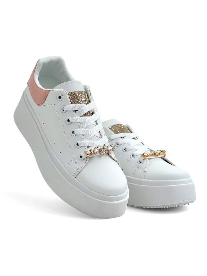 - Elegant white sneakers with a shimmering metallic detail. Footwear made of eco-leather and fabric inserts. Perfect for casual outfits.
