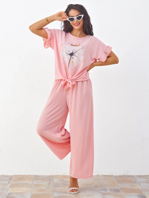 - Women's set made of pleasant fabric. The blouse has a round neckline, short sleeves, a print, and a tie. The wide trousers have an elastic waistband. A must-have this season! NOTE: Measurement accuracy (+/-) 1 cm.
