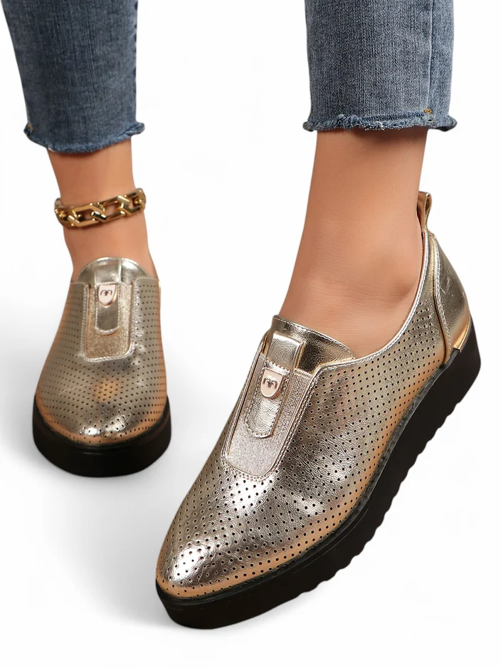 - Women's perforated shoes on a thicker sole. The slip-on upper is made of eco-leather, the insole is made of eco-leather. An ideal base for everyday outfits!
