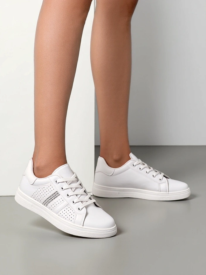 • Openwork women's sports sneakers made of eco leather and fabric insole. Model on a flat sole. They will fit perfectly to everyday styling!