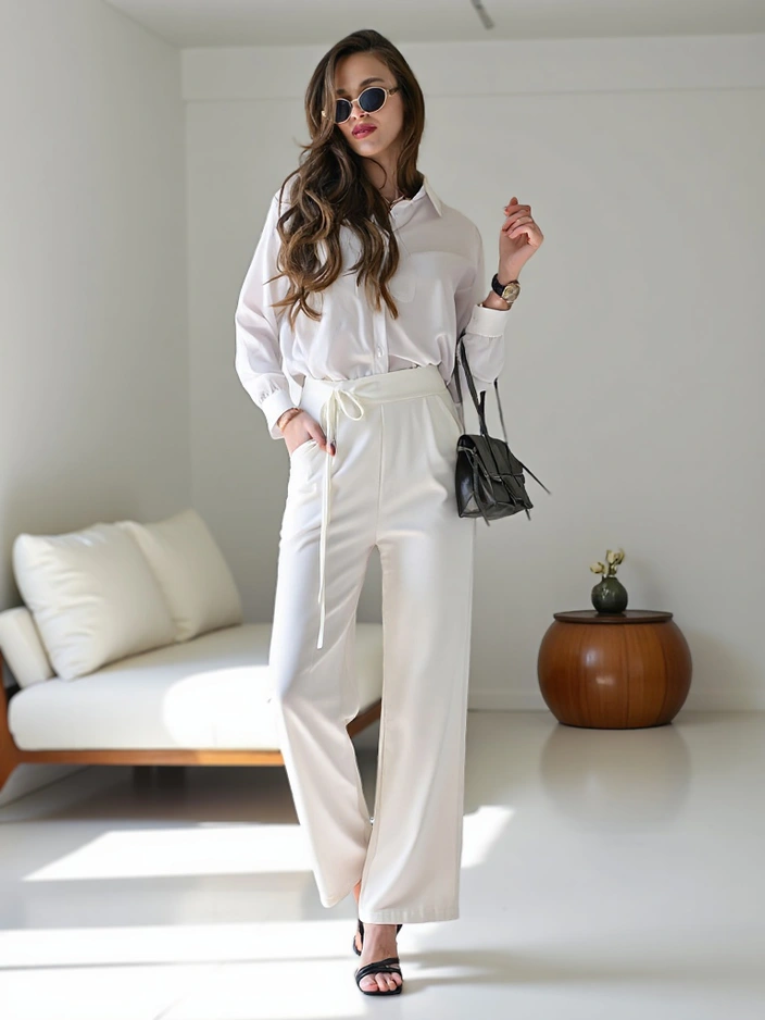 - Amazing wide trousers made from lightweight fabric, the model features 2 pockets and an elastic waistband. Additionally, there is a tie on the side. A must-have in your wardrobe! NOTE: Measurement accuracy (+/-) 1 cm.