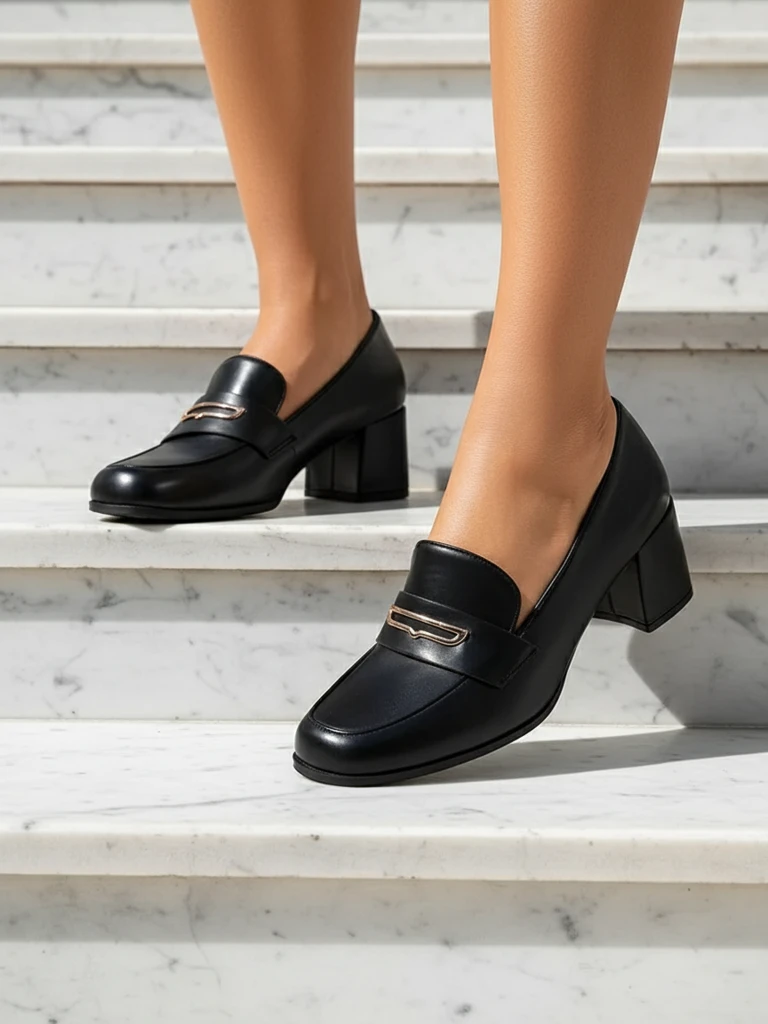 - Classic women's heeled loafers. The entire model is made of eco-leather. The shoes have a subtle decoration on the upper. An ideal everyday basic!