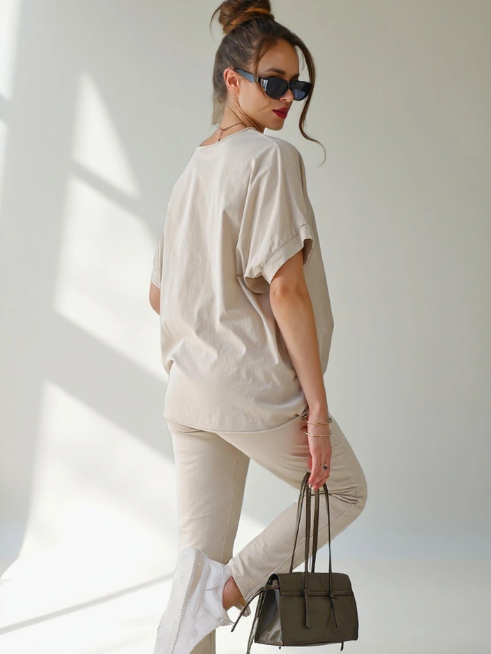 • Women's casual set made of pleasant fabric. The blouse is pull-over style, has short sleeves and a round neckline. Straight trousers with an elastic waistband. Perfect for those who value comfort.