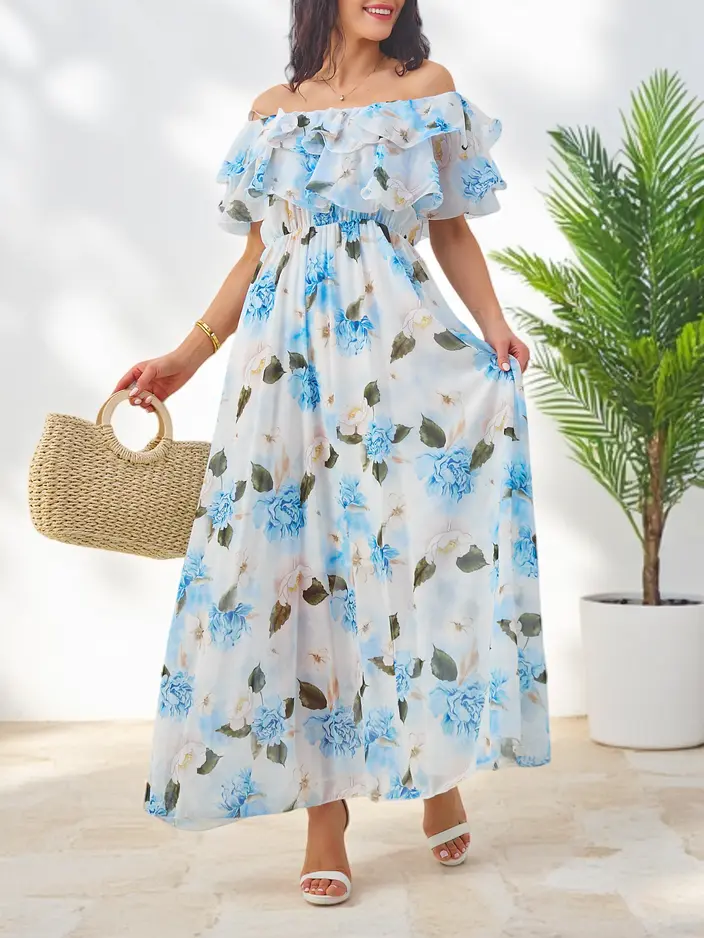 - The women's off-the-shoulder dress with short sleeves in floral print is a light and feminine option for warm days. The elastic top and romantic cut accentuate the silhouette, while the vibrant flowers add freshness and charm. Perfect for summer walks and