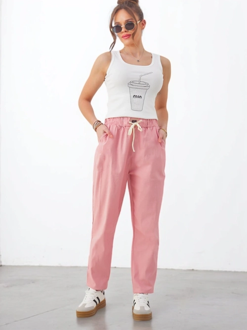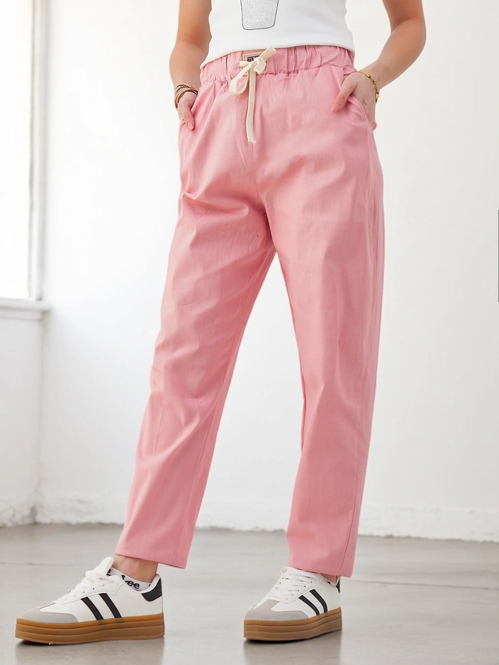 - Phenomenal tapered trousers made from lightweight fabric, the model features an elastic band and drawstrings at the waist. Additionally, it has 2 pockets. A hit of the season! NOTE: Measurement accuracy (+/-) 1 cm.