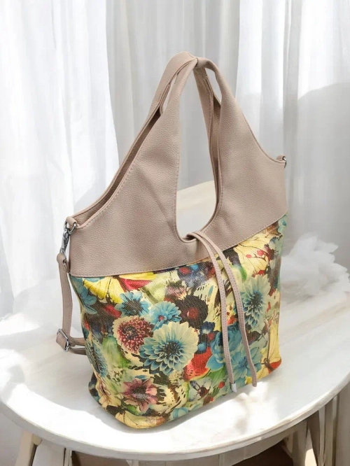• Large eco-leather bag with flowers and a zipper closure is a practical and stylish accessory. It has 1 compartment with a pocket. The floral pattern adds lightness and charm to it.