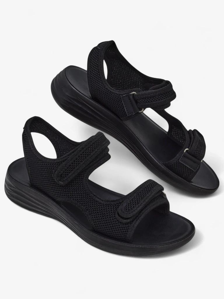 - Women's sporty flat sandals with fabric straps and a rubber insole. These women's shoes fasten with Velcro straps and fit snugly to the foot!