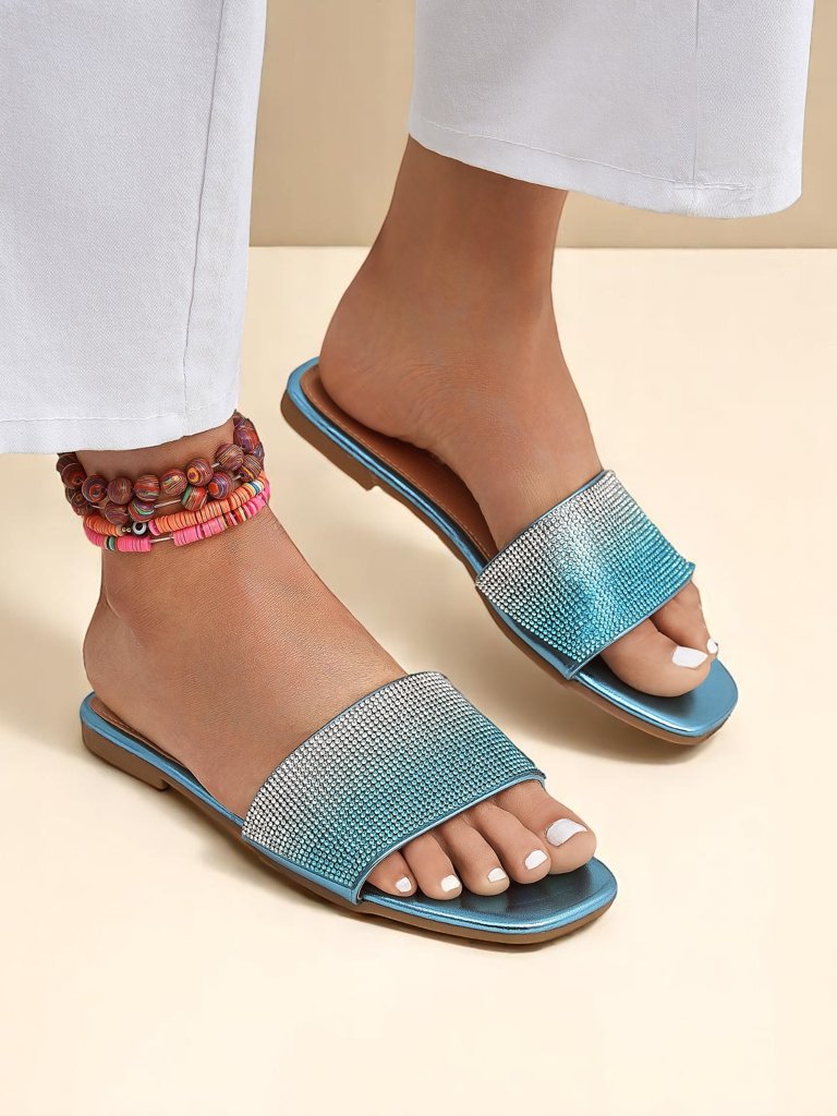 - Flat women's flip-flops made of eco-leather, decorated with zircons and an ombre effect. Stylish, shiny, and comfortable - perfect for summer, they will add sparkle to any outfit.