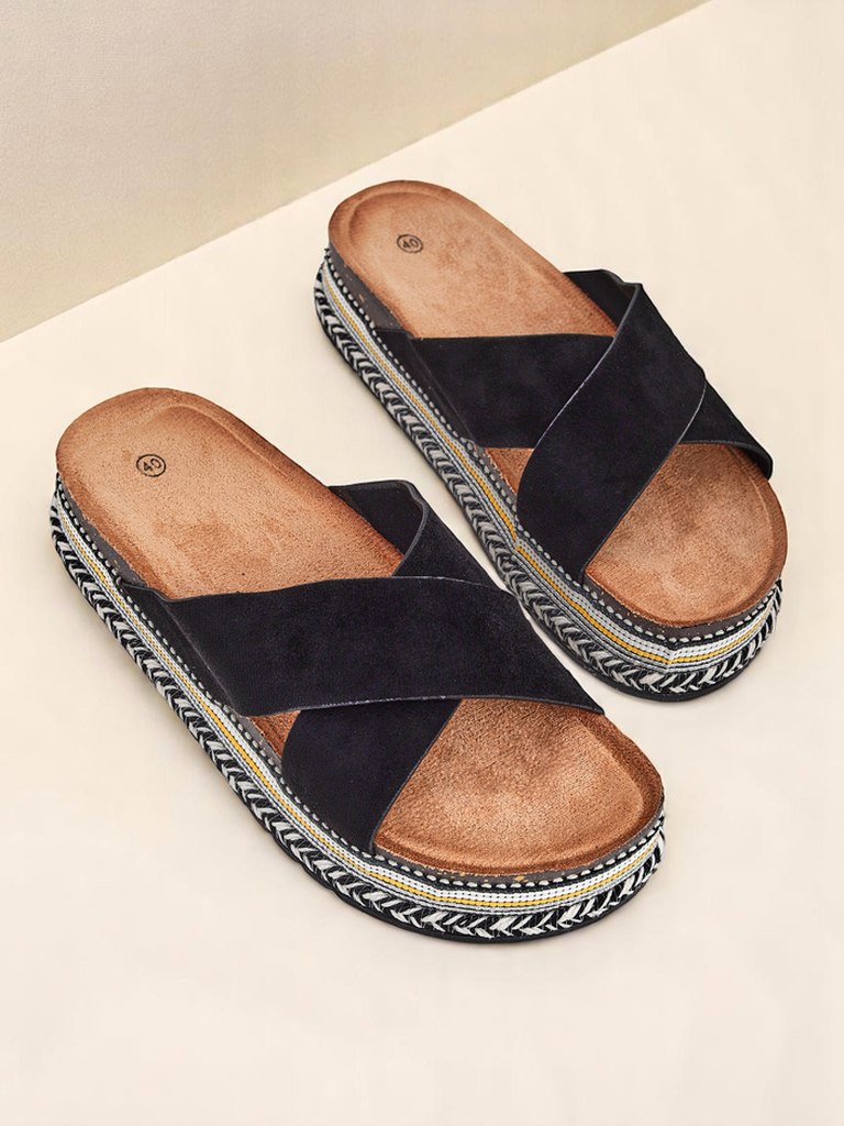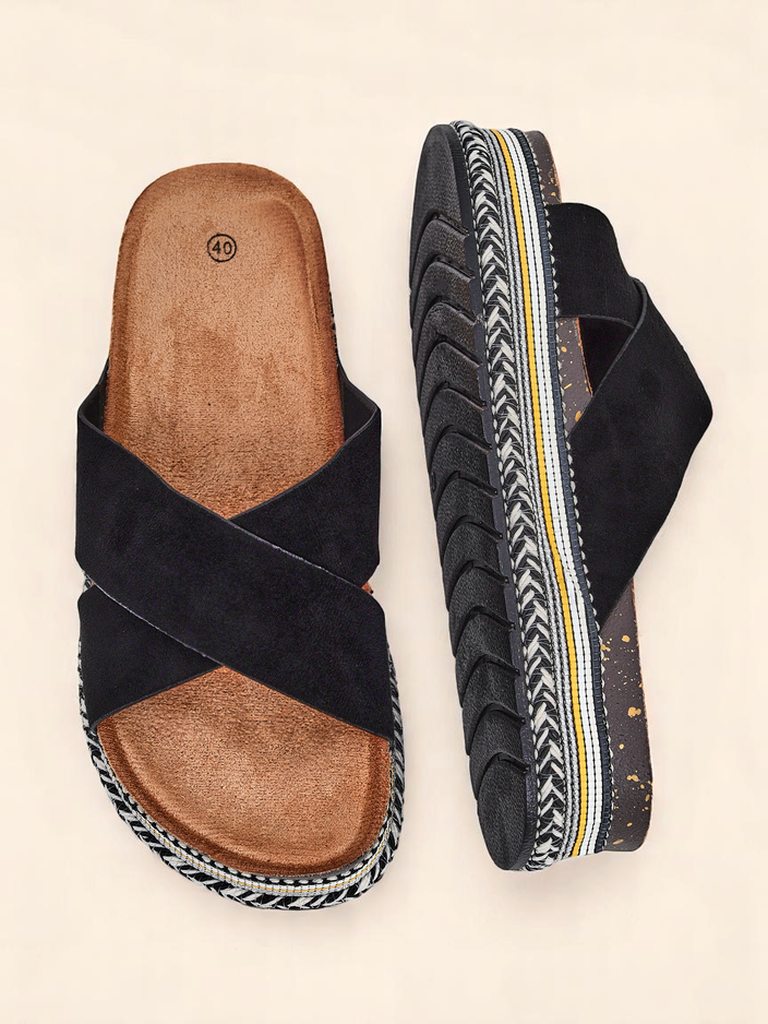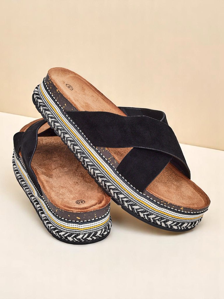 Atrium Nero platform sandals are inspired by the Mediterranean style, designed for women who value comfort and unique design. The upper part of the shoe is made of high-quality synthetic suede, which ensures softness, breathability, and wearing comfort even throughout the day. The criss-crossing straps elegantly hold the foot, adapting to its shape, while giving the whole a fresh character. The inside of the sandals is lined with skin-friendly textile material, which minimizes the risk of abrasions. The profiled insole made of soft microfiber perfectly cushions every step. The sole is made of lightweight EVA foam with increased abrasion resistance - this guarantees durability and stability. The original detail - a multi-colored, braided accent on the edges of the sole, gives the whole a unique look. Atrium Nero is an ideal choice for summer walks, trips to the city, as well as comfortable footwear for holiday trips. The fashionable design, emphasized by contrasting stitching and fashionable black and white accents, makes the sandals fit in with current slow fashion trends and boho style inspirations. How to style Atrium Nero sandals? 1. Combine them with a flared maxi dress or a boho skirt - for the beach or a summer festival. 2. For everyday wear, choose denim shorts and a light T-shirt or a hazy shirt - a light and comfortable styling for a walk around the city. 3. For going out to lunch or meeting friends, opt for a set: linen culottes + a basic top + large sunglasses. Care and storage: Clean suede straps with a suede brush or a soft sponge. In case of dirt, use special suede cleaning agents. Store shoes in a dry place, avoid contact with water. The sole can be wiped with a damp cloth. Atrium Nero is a fashionable answer to the hot trends of this summer - platforms are back in style, providing comfort, lengthening the figure and adding originality to any styling.