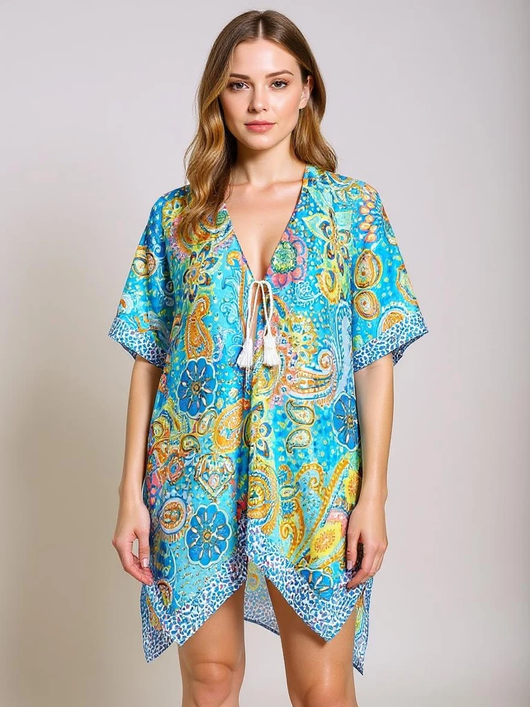 - This summer beach tunic, pareo style, with a V-neck and asymmetrical hem, is a stylish must-have for your vacation. The airy, lightweight fabric and eye-catching pattern accentuate femininity, while the loose fit ensures comfort on hot days. Perfect for t