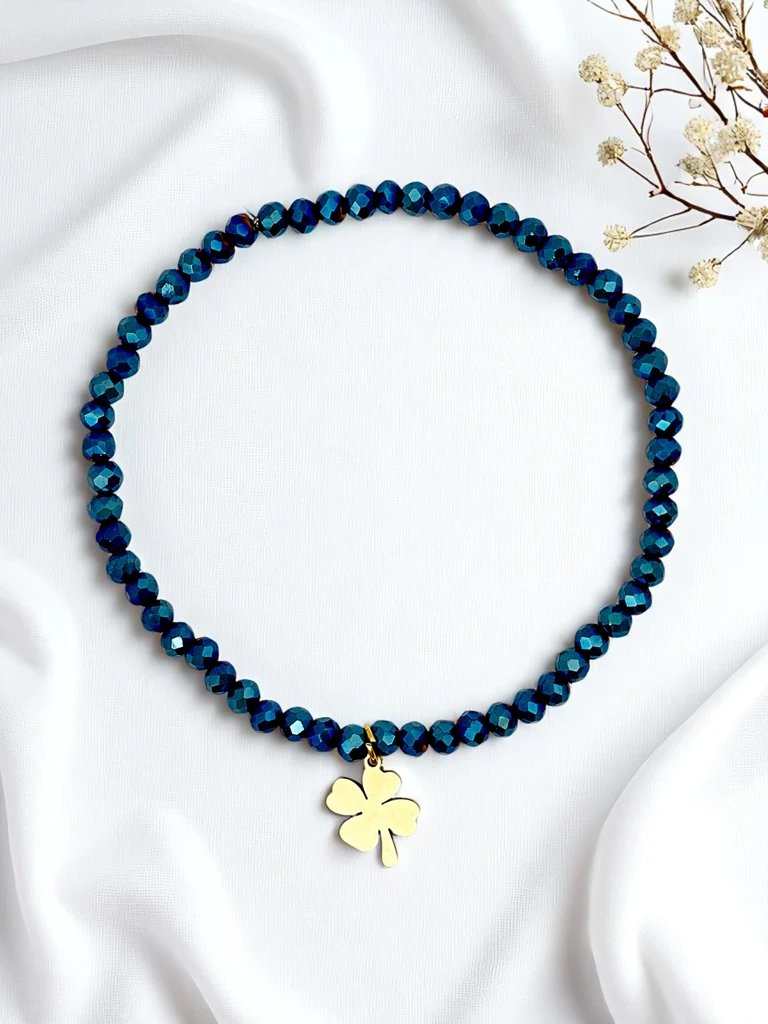 - Bracelet with beads and clover charm is a stylish lucky talisman. Delicate and elegant, it symbolizes good fortune, hope, and positive energy. Perfect for everyday wear, as a subtle accessory with a unique message.