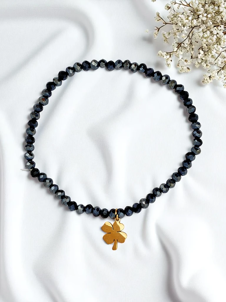 - Bracelet with beads and clover charm is a stylish lucky talisman. Delicate and elegant, it symbolizes good fortune, hope, and positive energy. Perfect for everyday wear, as a subtle accessory with a unique message.