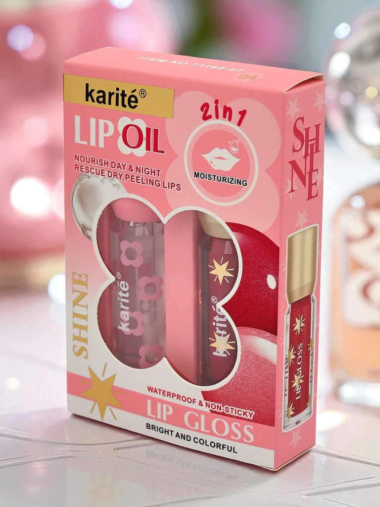 - 2-in-1 lip gloss – clear and with glitter. Perfect for wearing alone or as a top coat. Provides shine, hydration, and a glamorous effect in one application.
