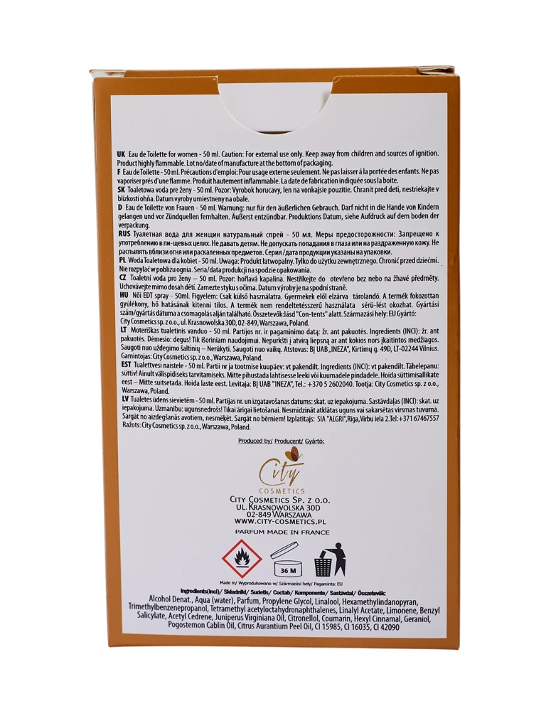Composition of ingredients: denatured alcohol, water, perfume, propylene glycol, linalool, hexyl cinnamal, limonene, benzyl salicylate, accepted aldehyde hydrate, citronellol, coumarin and juniper fruit and orange peel oil. Enriched with notes of cedarwood, lavender, citrus and delicate flowers, it creates a multi-dimensional, feminine fragrance that envelops the skin in a mist of sophistication.