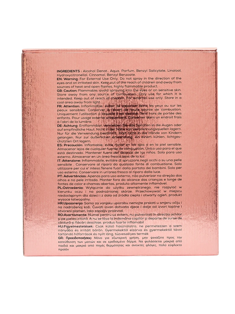 • The fragrance opens with sweet notes of ylang ylang, vanilla, and popcorn, which transition into a sensual heart of mallow, musk, sandalwood, and orange blossom. The base of peach, amber wood, white musk, and coconut creates a warm, seductive composition.