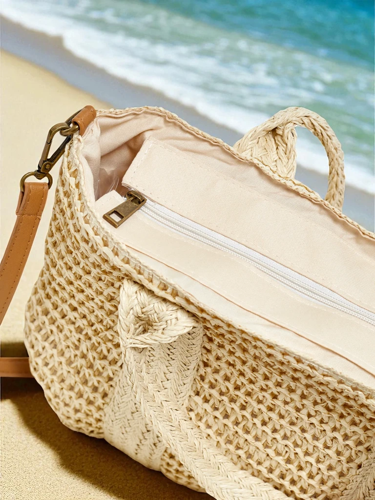 - Stylish straw bag with a single compartment and pocket, fastened with a zipper. Lightweight and spacious, ideal for summer days. Perfect for casual outfits, it provides comfort and organization while maintaining a fashionable, holiday charm. Perfect for t