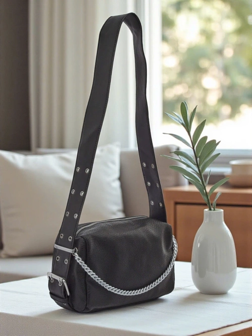 - Small women's handbag made of eco-leather, with a single zippered compartment. The stylish wide strap ensures comfortable carrying, and the decorative chain adds elegance. Ideal for everyday use and evening outings – lightweight, handy, and impressive.