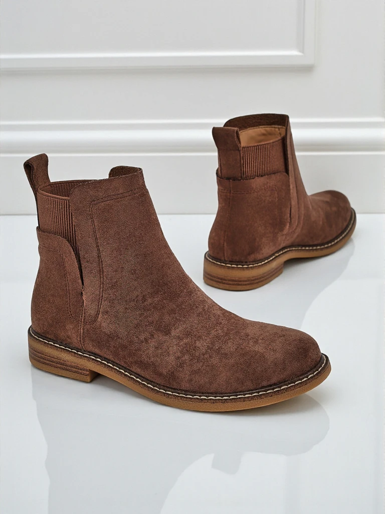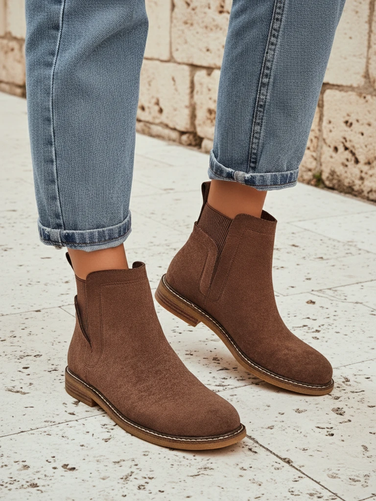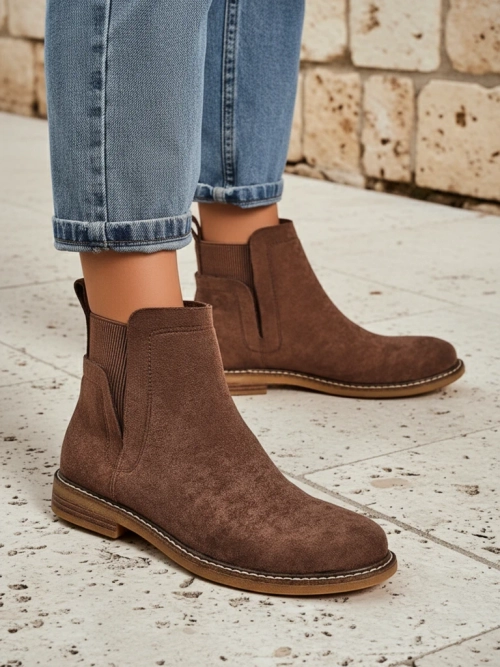 Chelsey Selene Brown ankle boots are made of high-quality suede ecological leather, distinguished by its softness and pleasant structure. This material imitates natural suede, while providing greater resistance to dirt and ease of care. Modern technologies were used in production without the use of animal products, confirming concern for the environment. The inner insole is made of delicate fabric, which ensures wearing comfort throughout the day. The brown color and classic, round toe make Selene ankle boots extremely versatile, suitable for many styles and occasions. The flat heel guarantees stability and everyday comfort, making them an excellent choice for people who value functionality and fashionable appearance. The most important advantages of these ankle boots are modern design, high durability and extremely easy cleaning. The shoes are warm and pleasant to the touch, and the leather is breathable, preventing the foot from overheating. Elastane inserts on the sides make it easy to put on and take off the shoes.:1. Casual style – combine with slim jeans and a thick sweater in a beige shade for an everyday, urban look.2. Boho chic – pair the ankle boots with a short floral dress and a ramones jacket to add some freedom and character.3. Work look – wear ankle boots with linen cigarette pants and an oversized shirt, creating a comfortable and professional outfit.: Clean the suede eco-leather gently with a suede brush or a special eraser. Avoid exposure to heavy rain and moisture - after returning home, leave your shoes to dry in a well-ventilated place. For storage, it is best to use the original box or a bag made of breathable material to maintain the perfect shape of the shoes.: Chelsey ankle boots in shades of brown refer to minimalist and smart casual trends that dominate world catwalks. Natural colors and the raw structure of suede emphasize individuality and allow for great styling freedom. This is a model that never goes out of fashion and works great throughout the autumn and winter season.