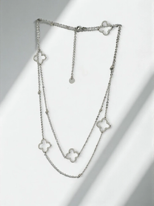 The Livia Quattro Argento silver necklace is a combination of classic elegance and modern minimalism. It is made of high-quality 925 silver, resistant to corrosion and skin-friendly, as confirmed by international quality certificates. The silver has been carefully polished to a high gloss using specialized jewelry techniques to ensure unique shine and durability. The decorative elements in the shape of four-leaf clovers symbolize happiness and originate from motifs used in Italian and Byzantine art. Thanks to them, the necklace is perfect for both everyday wear and special occasions. The delicate chain ensures lightness and wearing comfort, and the subtle form will add charm to any styling. The necklace fits perfectly with various clothing sets: 1. In a casual style - worn with a white shirt and jeans, it will emphasize natural elegance. 2. In the evening version - it looks great with a black dress or a satin top. 3. For everyday wear - combined with a pastel sweater or a plaid shirt, it will add feminine charm. To keep the necklace shining for as long as possible, it is recommended to store it in a dry, closed box and avoid contact with water, perfumes and cosmetics. For cleaning, it is best to use a soft, dry jewelry cloth. The product is covered by the manufacturer's quality guarantee. Minimalist silver jewelry is a current fashion hit - delicate, geometric forms and versatility allow for free combination with other accessories. The Livia Quattro Argento necklace is an excellent choice for women looking for a timeless, stylish accent that will emphasize the individual character of each styling.