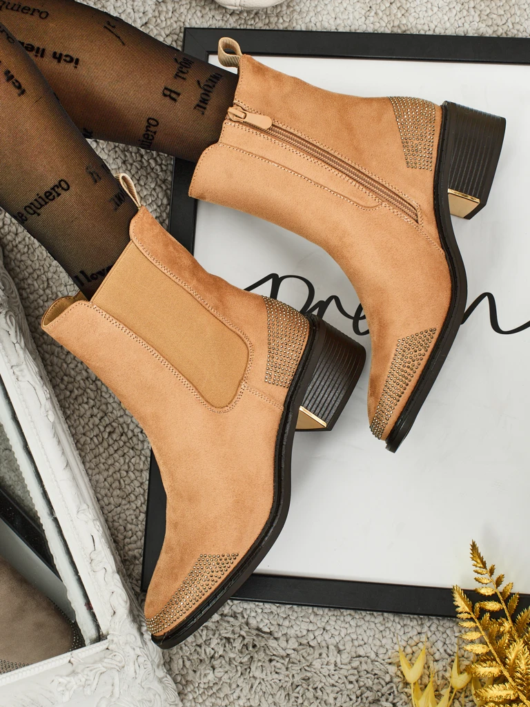 - Comfortable heeled ankle boots, made of eco-friendly suede leather. The model is zippered and decorated with rhinestones. It has a delicate lining in the form of fur.