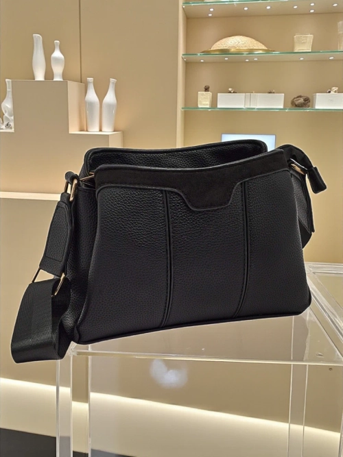- Small handbag made of a combination of faux leather and faux suede. Features 3 compartments, 3 pockets, a zipper closure, and an adjustable strap. Style and functionality in perfect harmony.