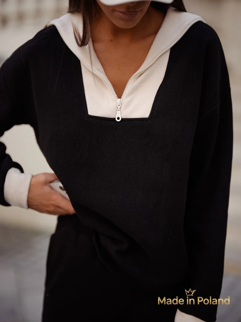 - Women's sweater set made of pleasant cotton material. Sweatshirt with a zipper at the neckline. Long pants with elastic at the waist and 2 pockets. Feel the style in this wonderful set!