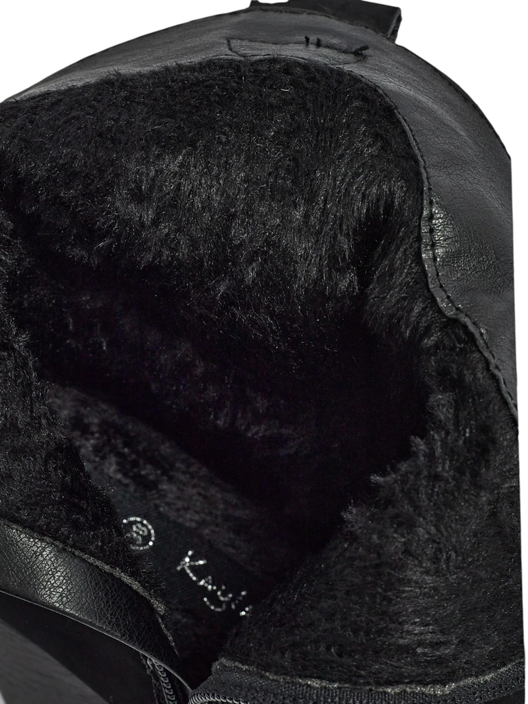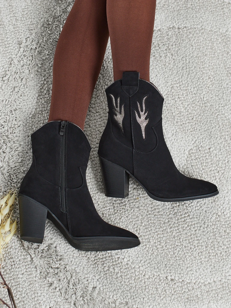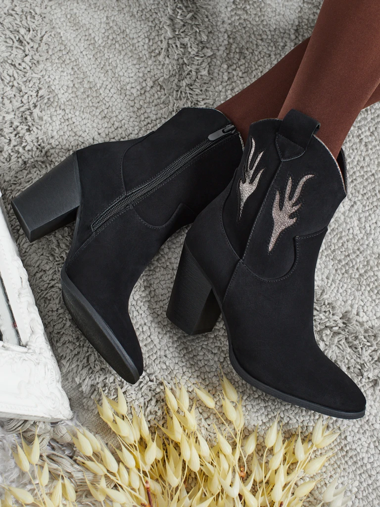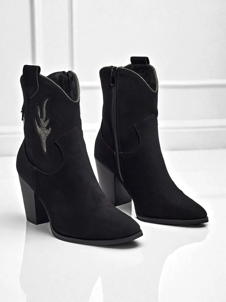 • Ankle cowboy boots with heels, made of matte ecological leather. The inside is insulated with fur, and the boots are fastened with a zipper with decorative glitter inserts. They match many feminine styles!